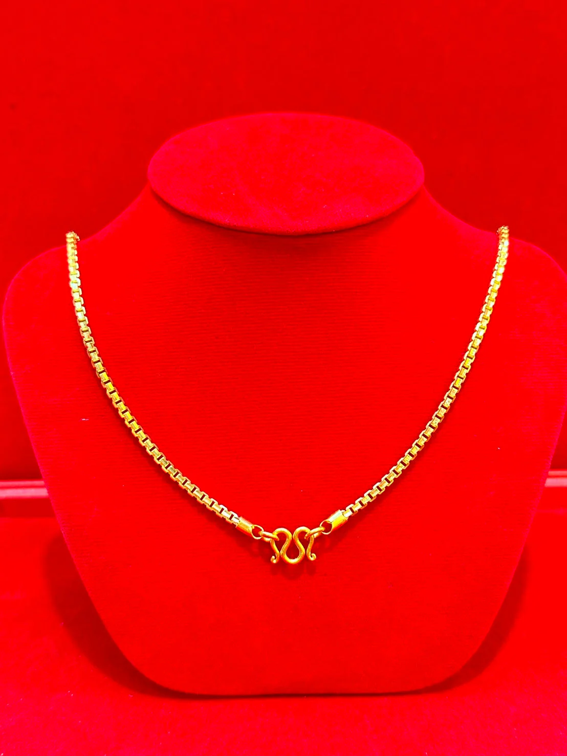 The sleek, geometric design of the Gold Box Chain delivers a minimalist and modern look. Crafted from pure gold, this chain offers durability and elegance, ideal for layering or wearing solo.