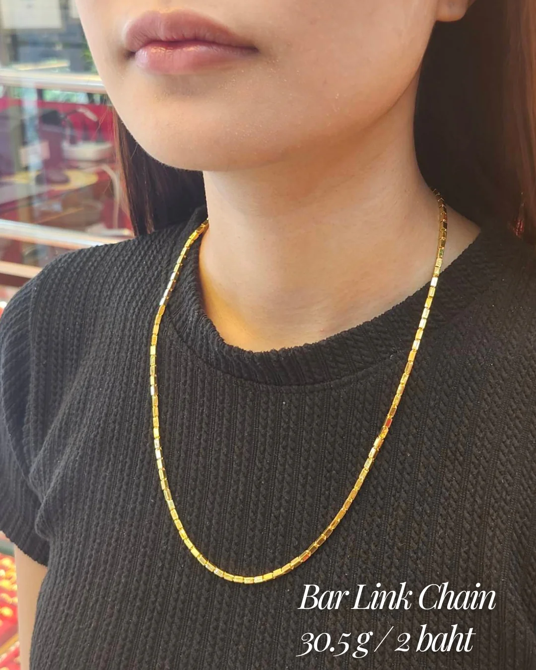 With its alternating horizontal bar links, the Gold Bar Link Chain provides a distinctive, structured look. Made from 23k or 24k gold, this chain is perfect for adding a touch of sophistication to your style.